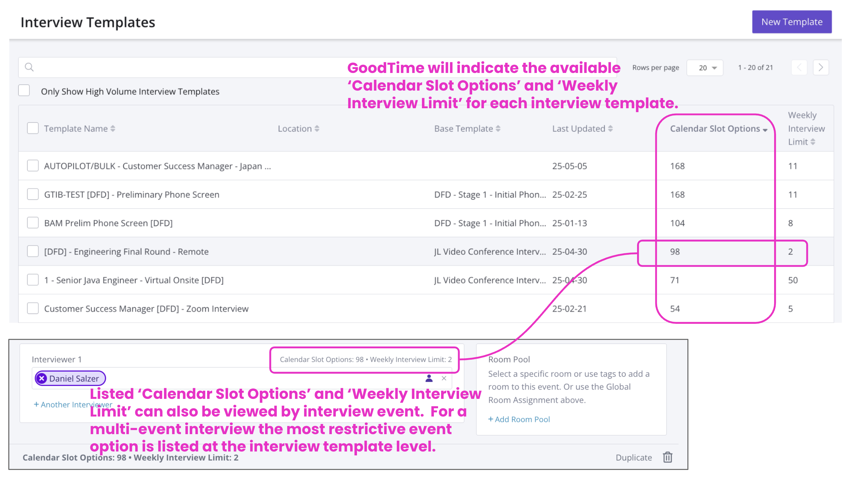 - At the template level we will list the most restricted interview event within each template as the overall template capacity.