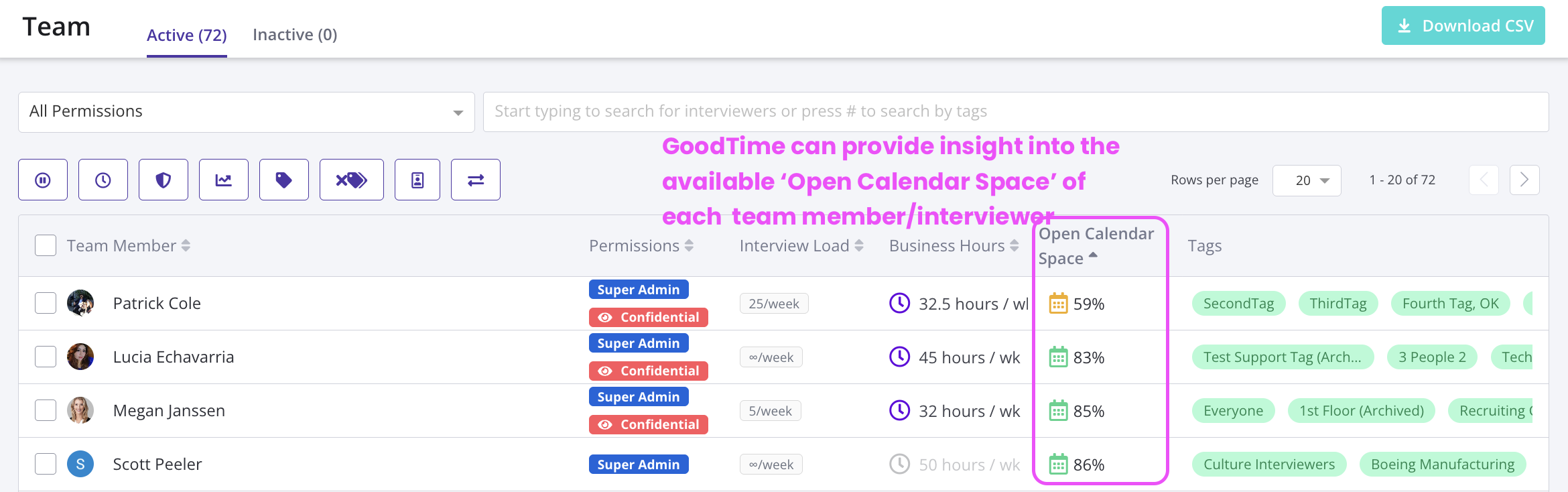 TL;DR: The GoodTime Calendar Availability & Capacity Planning  feature helps your team to identify interviewer availability bottlenecks across individuals, tags and interview templates so you can meet hiring goals with clarity and precision. NOTE: This feature is available for both Google and Office 365 calendar integrations.