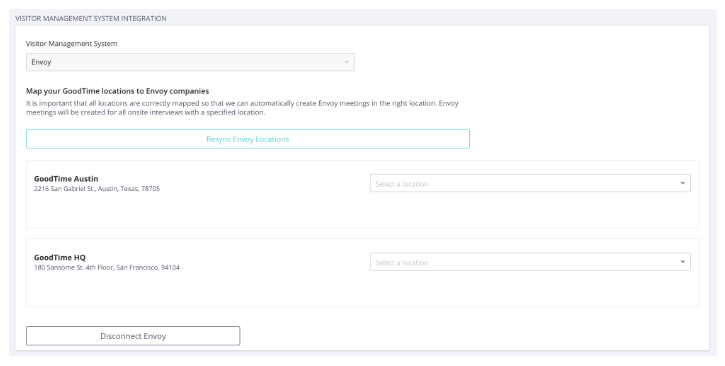 - We now need to map locations on GoodTime to a location and flow on Envoy. This needs to be done so that every time you make a GoodTime interview, we know which Envoy location the invite should be sent to.