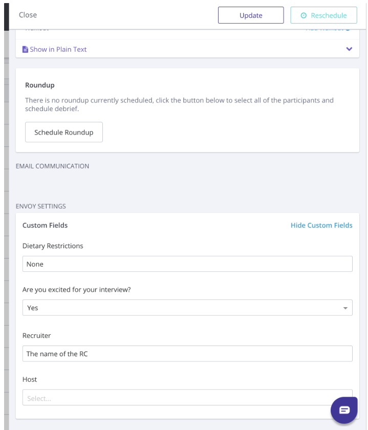 You can edit the custom fields of the Envoy meeting in the Interview drawer, even after the interview has been created. Don't forget to click Update up top once you edit anything!