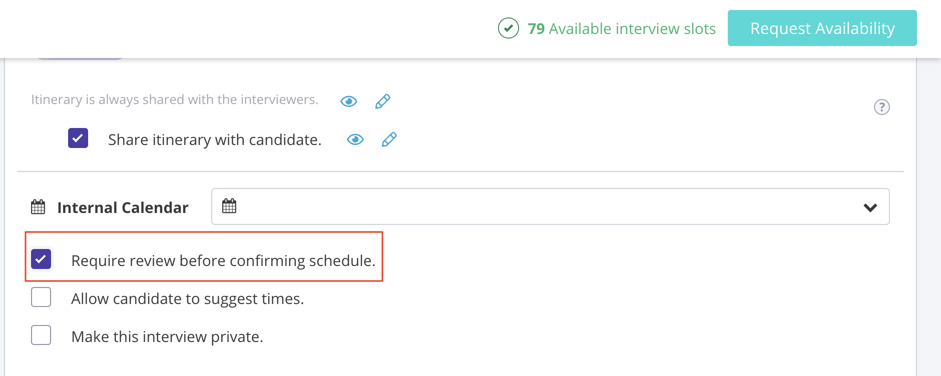 1- Request availability like you normally would and ensure click on “Require Review before confirming schedule." This workflow provides the stop gap to ensure that the candidate does not receive the assignment too soon, and we would hold the invite and the confirmation email until the take home is expected to happen.