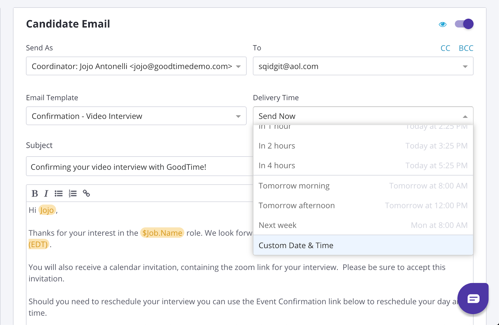 2- Once the candidate selects the time they want their take home and is in “Pending Review” status, when confirming the interview, you can use the "send later" function in the platform. You may select a custom date/time the candidate specified from the confirmation page, above the subject line of the email draft. This will send both the calendar invite and the confirmation email at the time specified by the candidate.