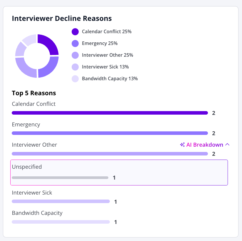 👎 Decline Reasons Free Text: Understanding your interviewer decline reasons is now even easier to achieve with the introduction of AI Summary of Decline Reasons. If one of the predefined declined categories does not suit, your users can now select "Other" and offer a free-text reason for the decline. GoodTime's AI will then review and collate all free text decline reasons into grouped categories (so you don't have to) and help you identify themes to the declines you are experiencing. ![]() |