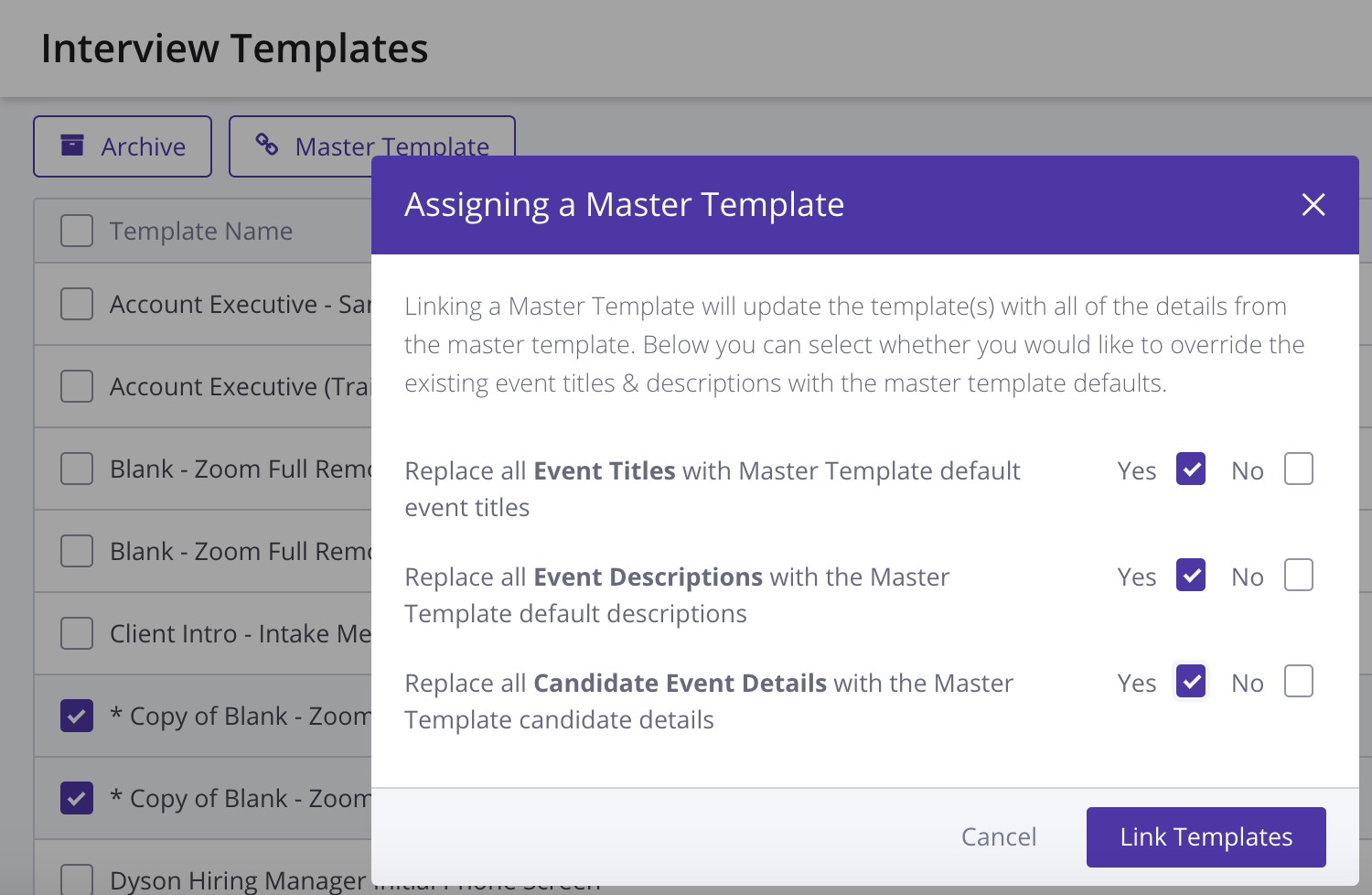 Select which parts of the Base Template - Event Titles, Event Descriptions, Candidate Event Details - you want to link and apply > then click "Link Templates"