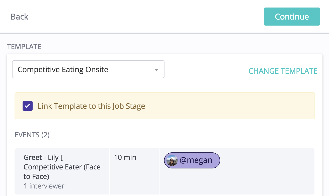 b. This will pull the template through to the left side of the side panel. Make sure the "Link Template to this Job Stage" box is checked, and click the Continue button when you are ready to continue with scheduling the candidate.