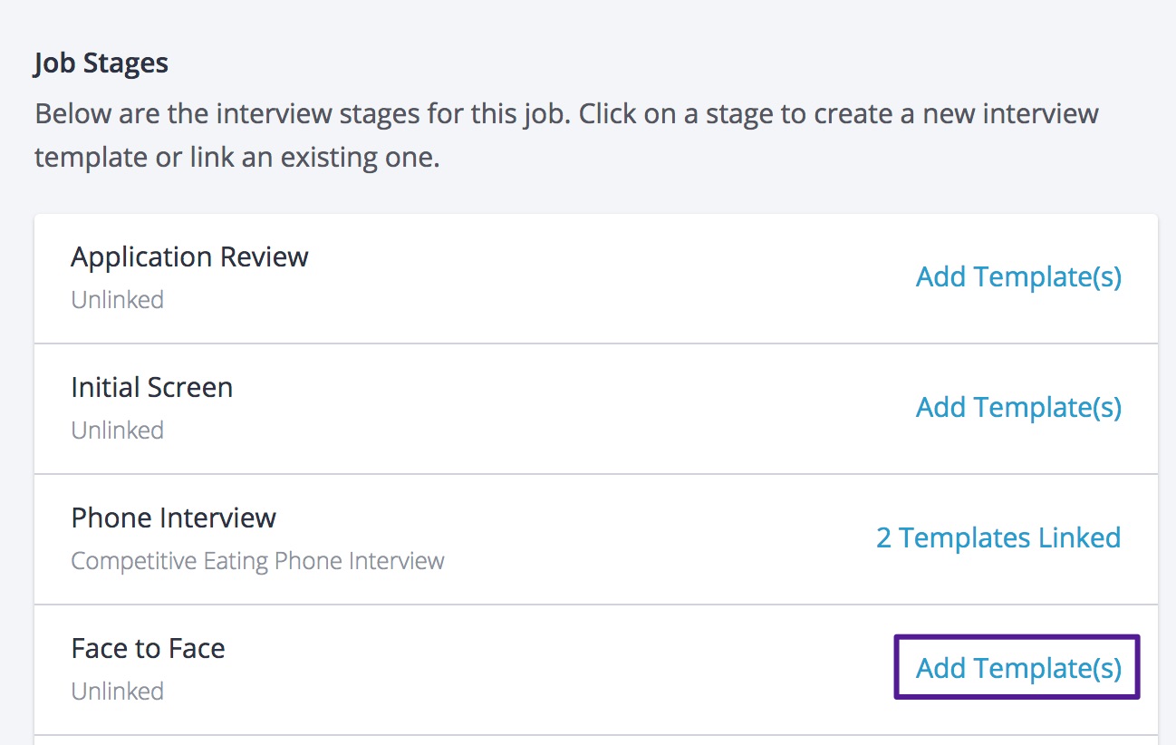 To correct this, link an Interview Template to this job and stage. This can be done one of two ways: