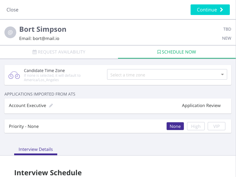 Also, if the candidate doesn't have a time zone, a drop-down menu will show up in the Request Availability and Schedule Now flow so that you can manually add them.