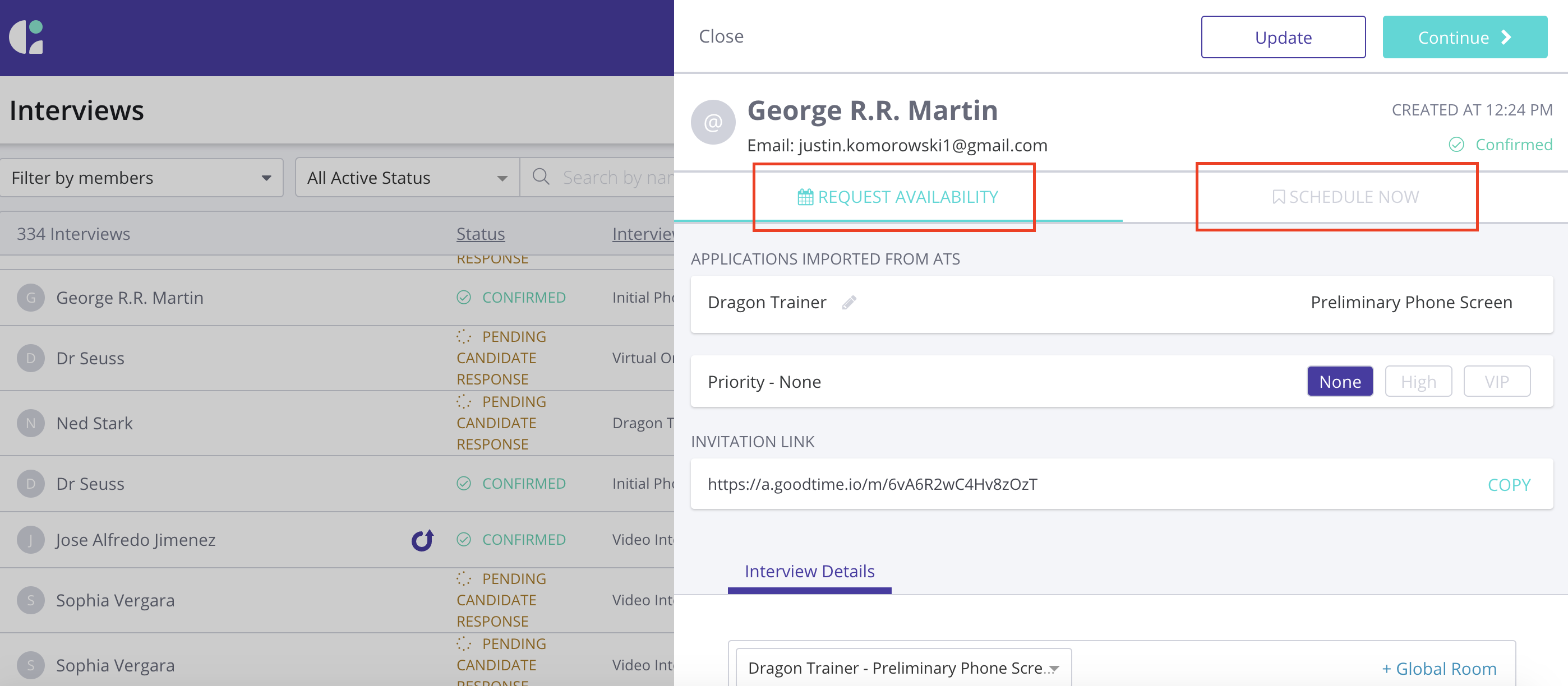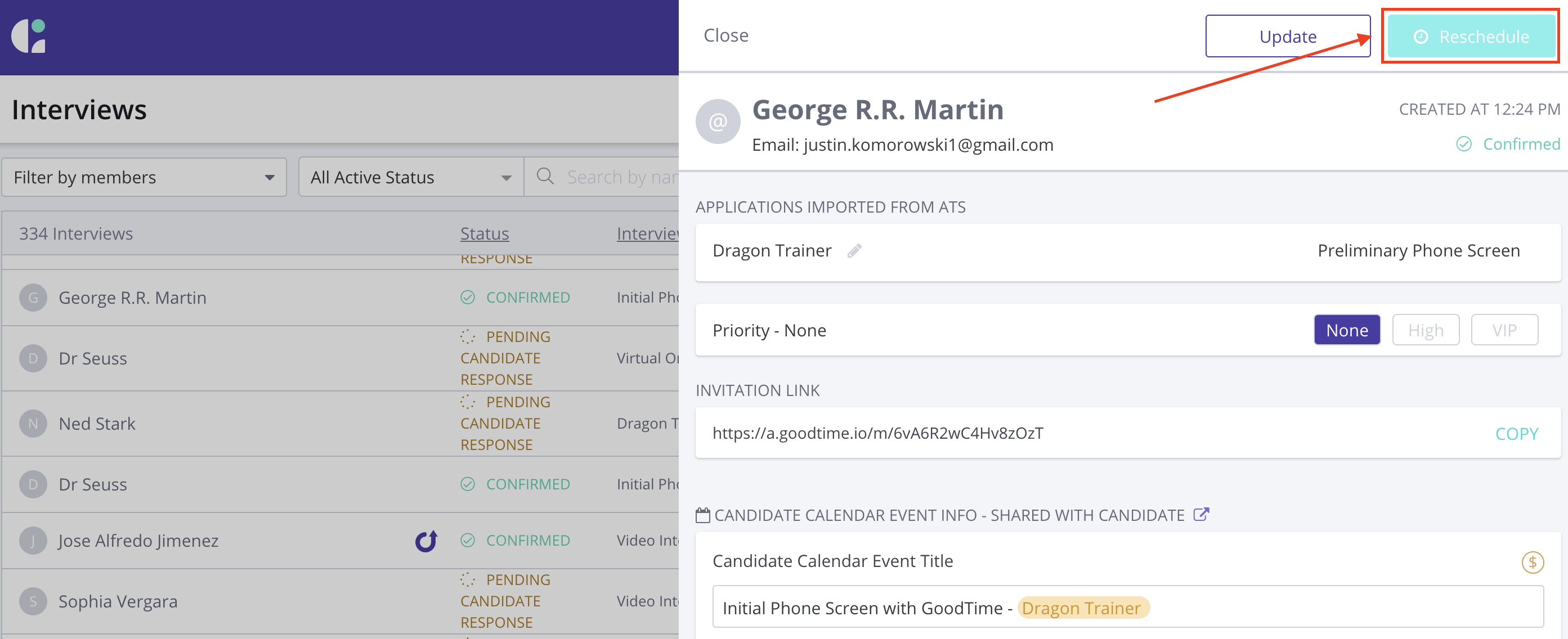 GoodTime will surface any dates and times the candidate previously shared with you as availability so that you can reschedule into your interviewer calendars.