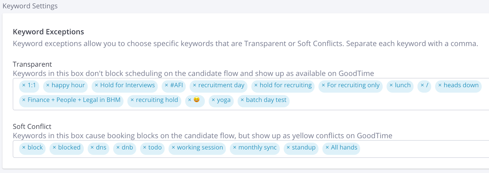 Transparent: These keywords will help us determine to read the calendar event as white space on an interviewer’s calendar. (Ex. yoga, happy hour)
