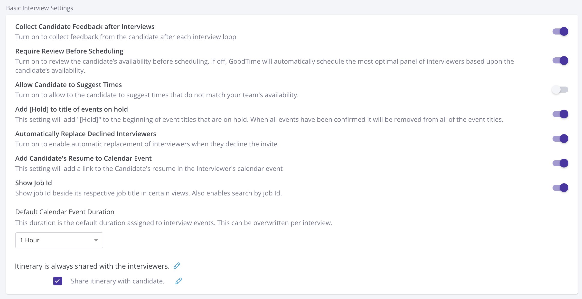 - If you would like to allow candidates to reschedule via GoodTime, we recommend turning this ON.