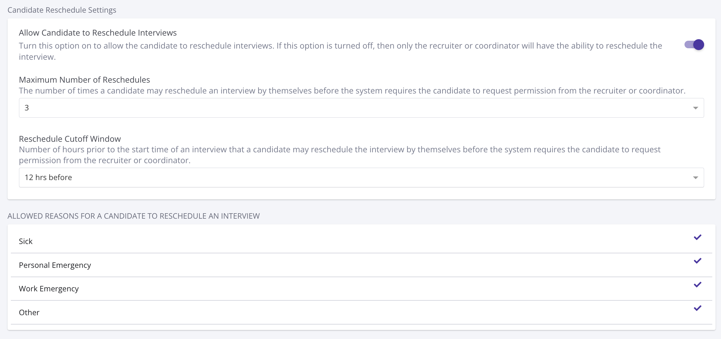 - If you turn this OFF, your candidate will have to reach out to the scheduler to reschedule their interview.