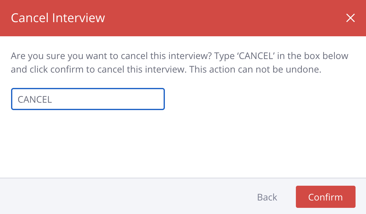 You have the option to notify your Candidate and/or Interviewers. Once you type CANCEL and click CONFIRM, the parties you have selected will be notified and the invite will be removed from the calendar.