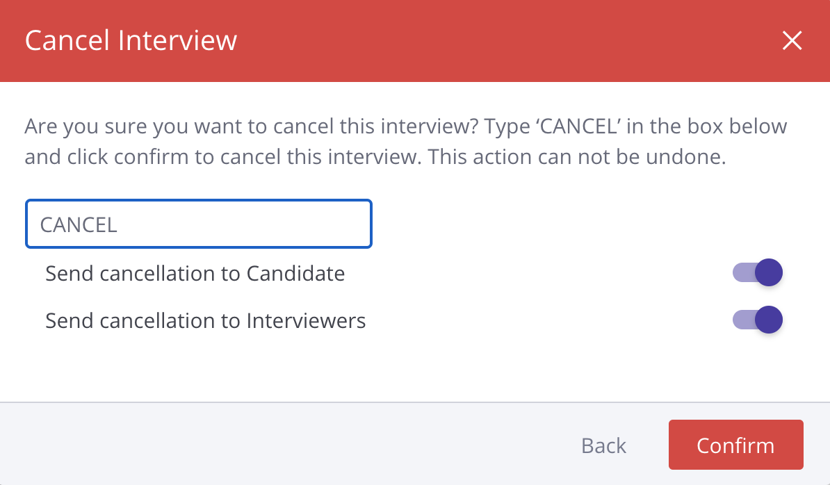 4. Type CANCEL in the text box and toggle on/off the option to send cancellations to the candidate and interviewers.