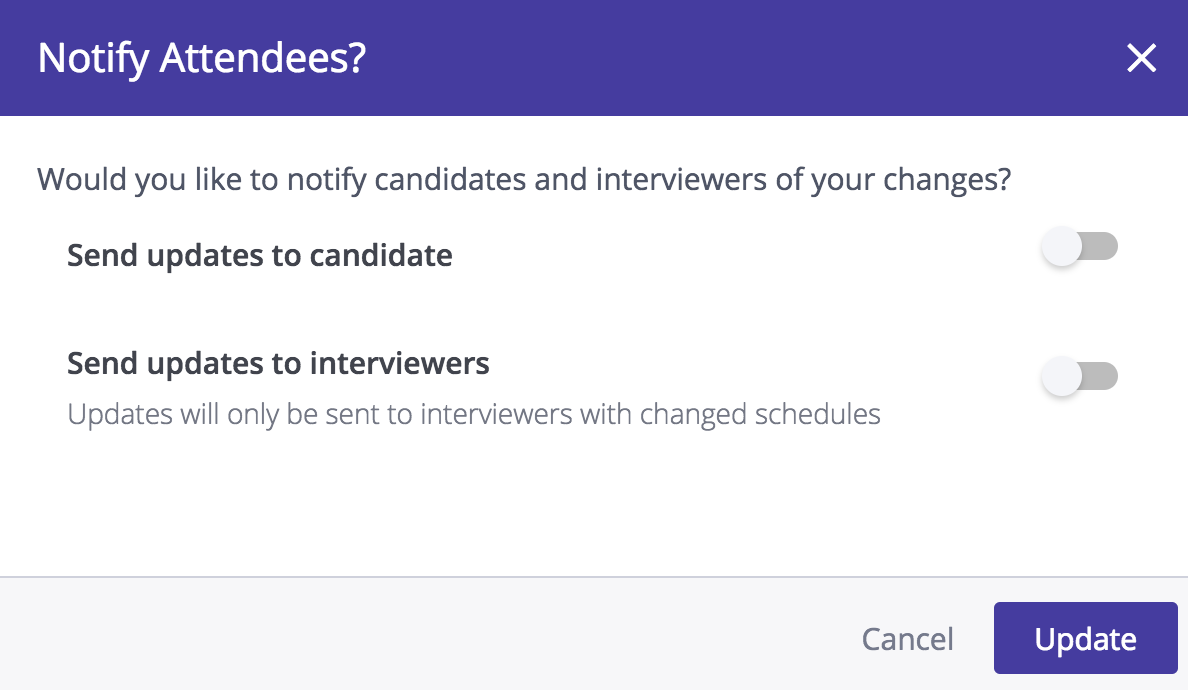 After you have made changes, you can either silently update the changes, send an update to the candidate or send an update to the interviewers (updates will only be sent to interviewers with changed schedules).