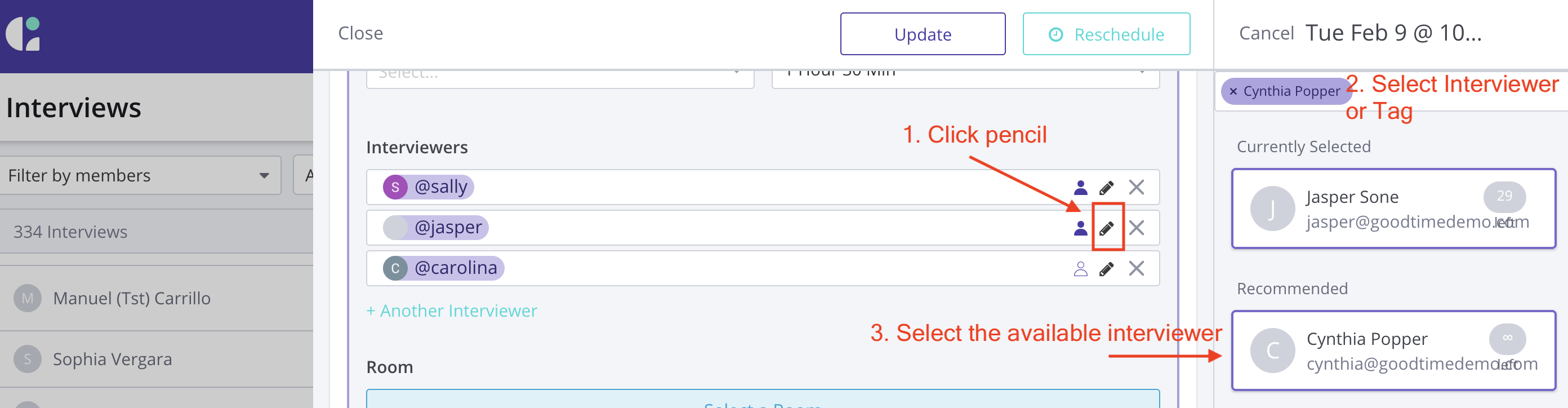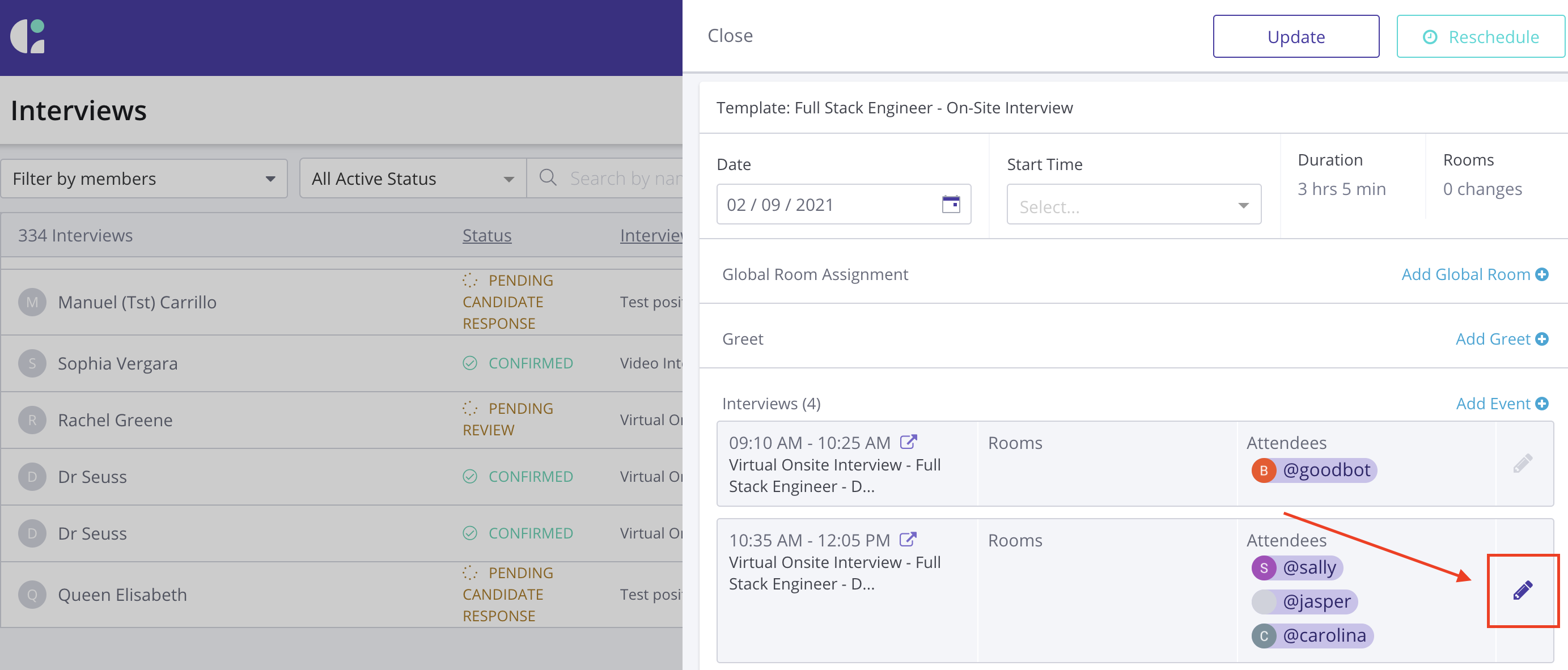 - Locate and open the interview in your GoodTime dashboard you want to update.