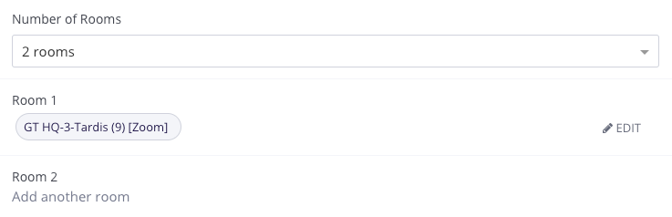 You can also add rooms to interviews after they have been scheduled. Click the pencil icon next to the event and update the dropdown list under “Number of Rooms”. Click “Add another room” and edit the internal calendar description as needed.