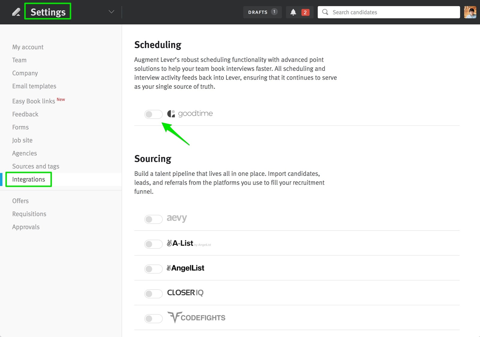 Under Settings, click Integrations. Under the Scheduling section, toggle on GoodTime.