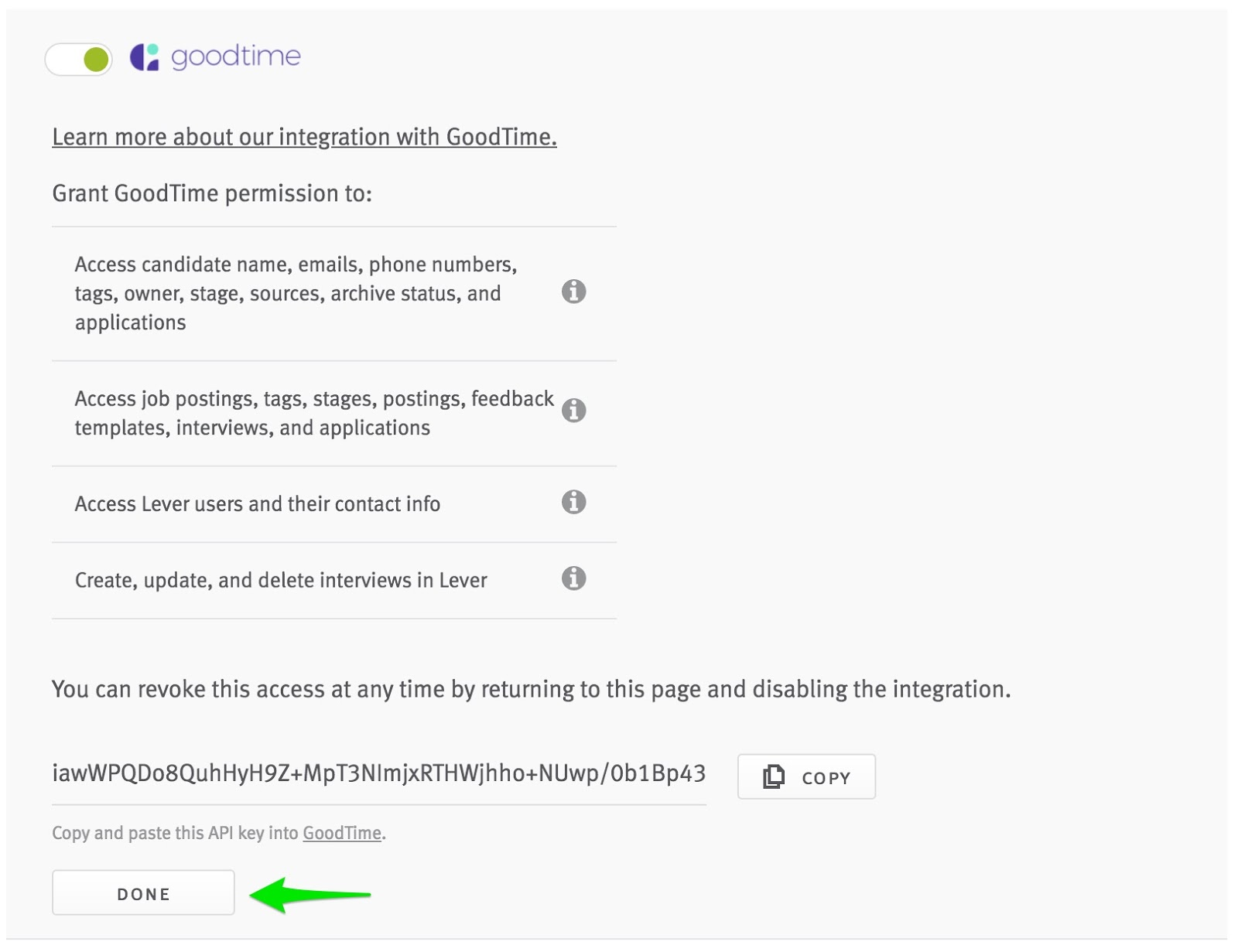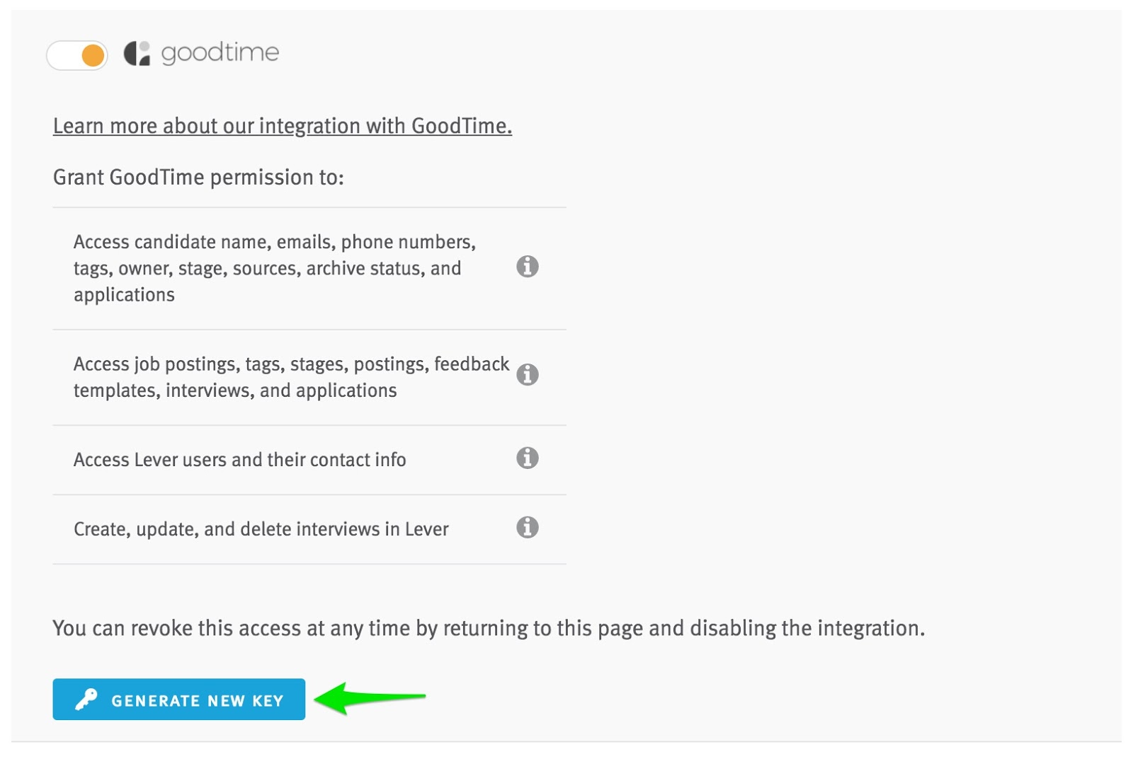 TL;DR: This article provides a step-by-step guide on how to integrate Lever with GoodTime (NOTE: to establish this integration you will need to be a Super Admin in GoodTime and have Admin permissions in Lever). This guide requires the user to create an API key from Lever, which gives GoodTime’s system access to candidate data as well as other data about job applications and the stages candidates are in.