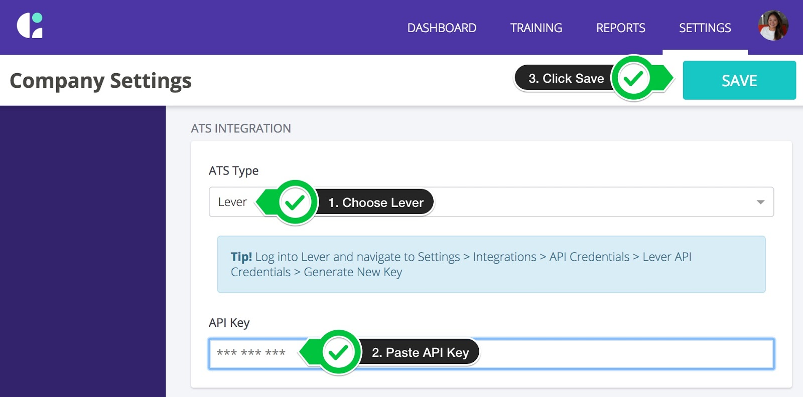 In GoodTime’s Company settings, click Lever in the dropdown menu. Paste the API Key. Click Save.