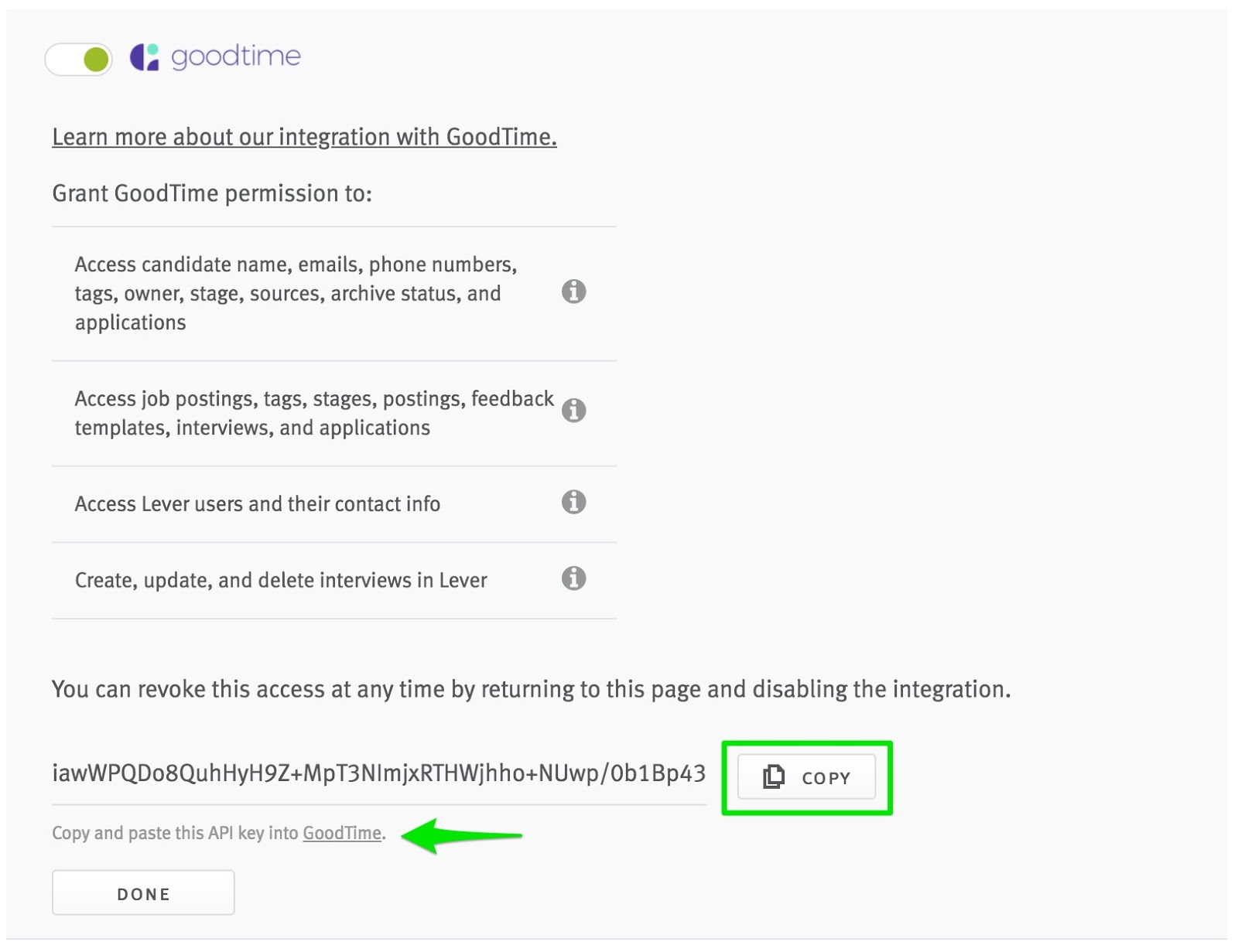 Click on COPY. Then click on GoodTime where it says “Copy and paste this API key into GoodTime.” This will open up the Company settings tab in GoodTime. *Note: Do not close out this tab. You will need to click Done after you complete Step 6.*