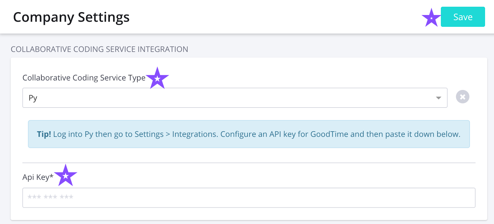 Go to GoodTime Company Settings https://a.goodtime.io/dashboard/settings/company and scroll down to COLLABORATIVE CODING SERVICE INTEGRATION