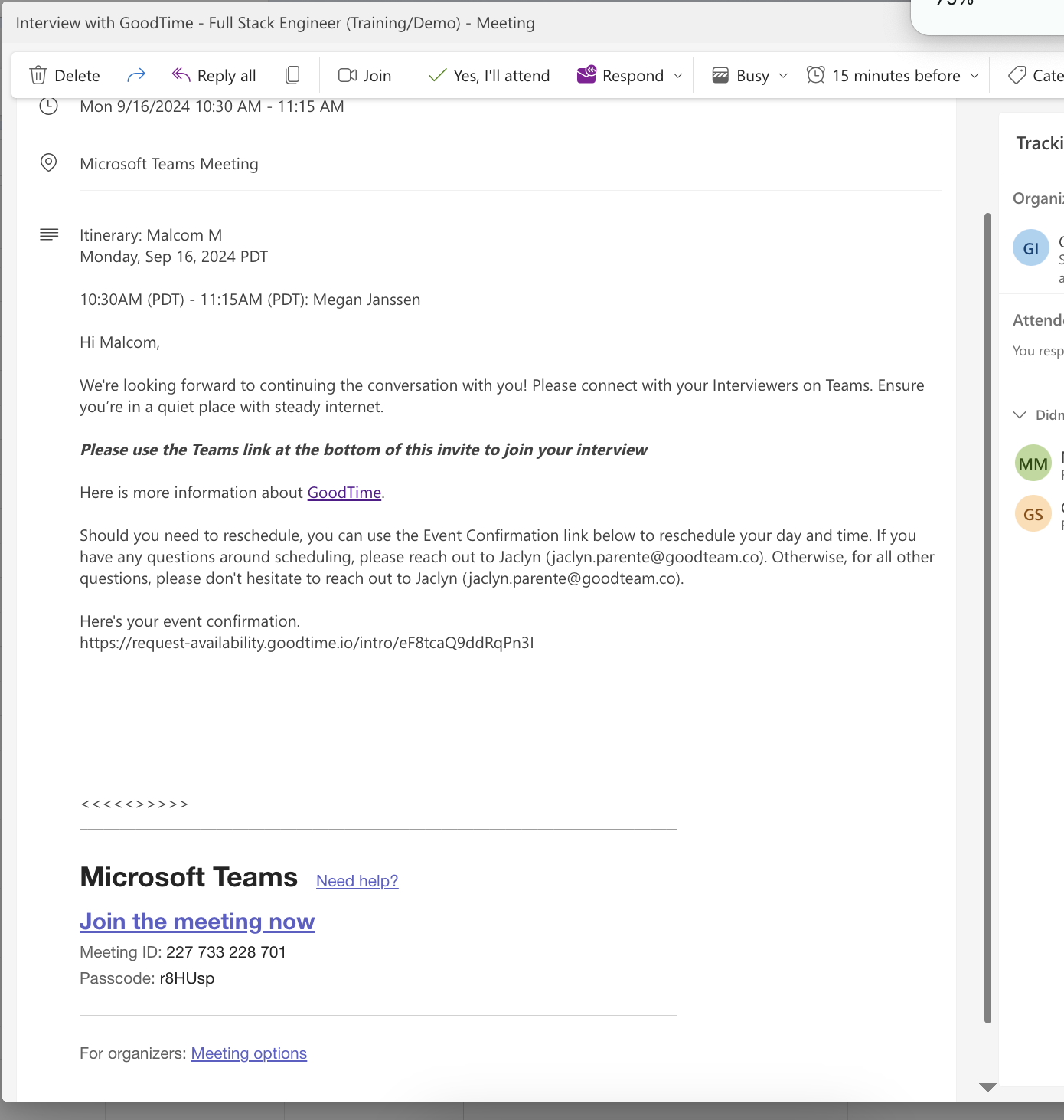 - In the Interviewer’s calendar invite, you’ll see the blue Teams link pulled in from the variable used in the template