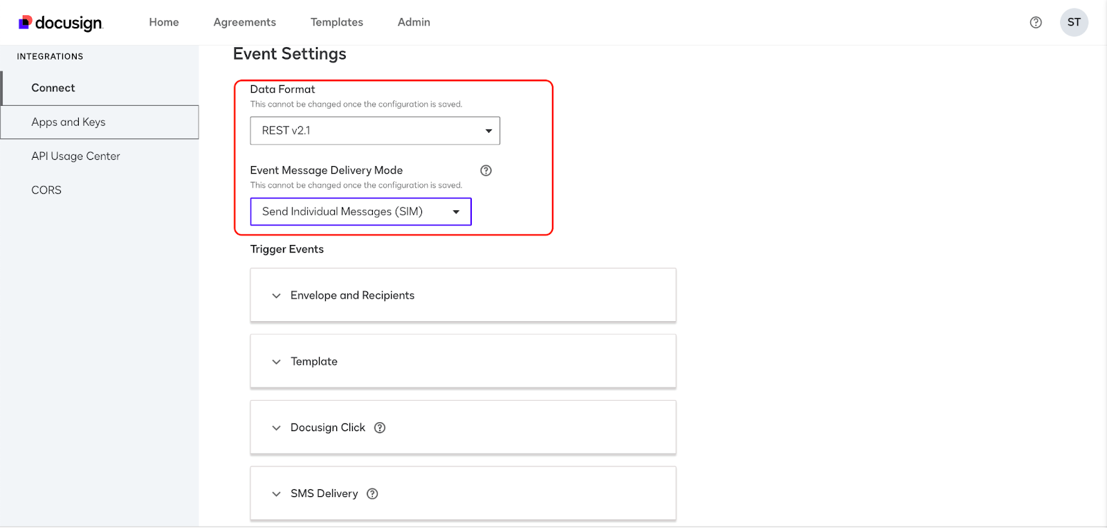 - Under the “Event Settings” session, make sure Data Format is “REST v2.1” and Delivery Mode is “Send Individual Message (SIM)”