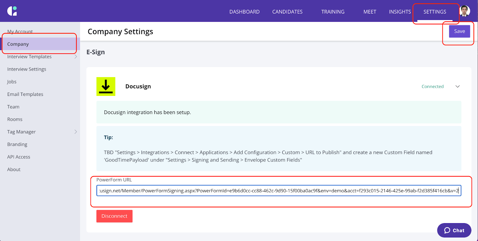 - Inside GoodTime, under “Settings”, select “Company” on the left-side-pane, scroll down to the “E-sign” section. You should see the “Docusign” section. Paste the URL from the previous step into the box and remember to click “Save” on top.