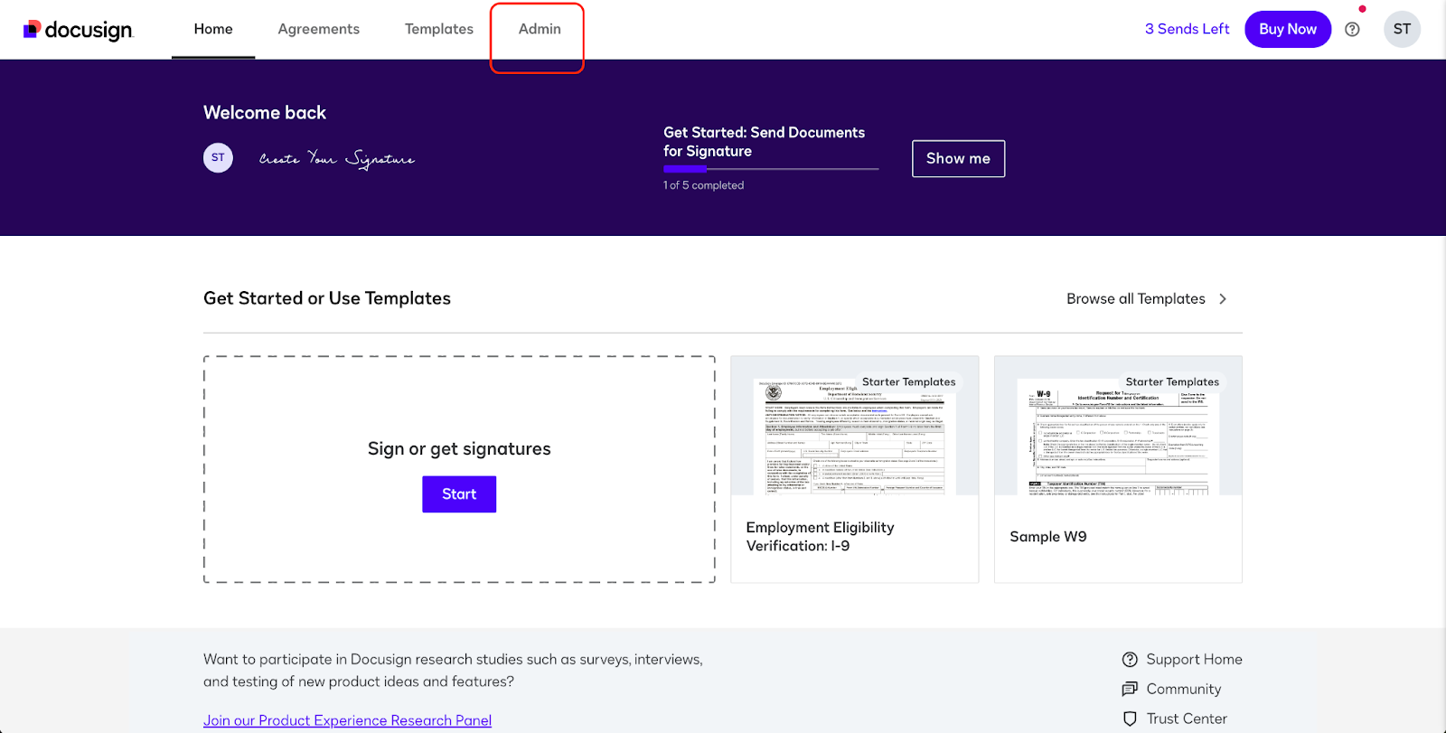 - From your Docusign Home, Go to “Admin”