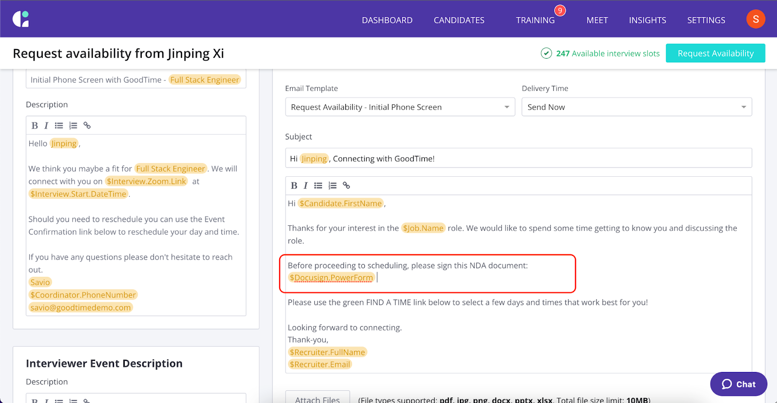 - In GoodTime’s “Request Availability” or “Schedule Now” workflow a user can insert a variable token “$Docusign.PowerForm” into the Email body text area. The variable token, when resolved, will pass interview information between GoodTime and Docusign. The following screenshot shows how to use the variable token in the “Request Availability” workflow: