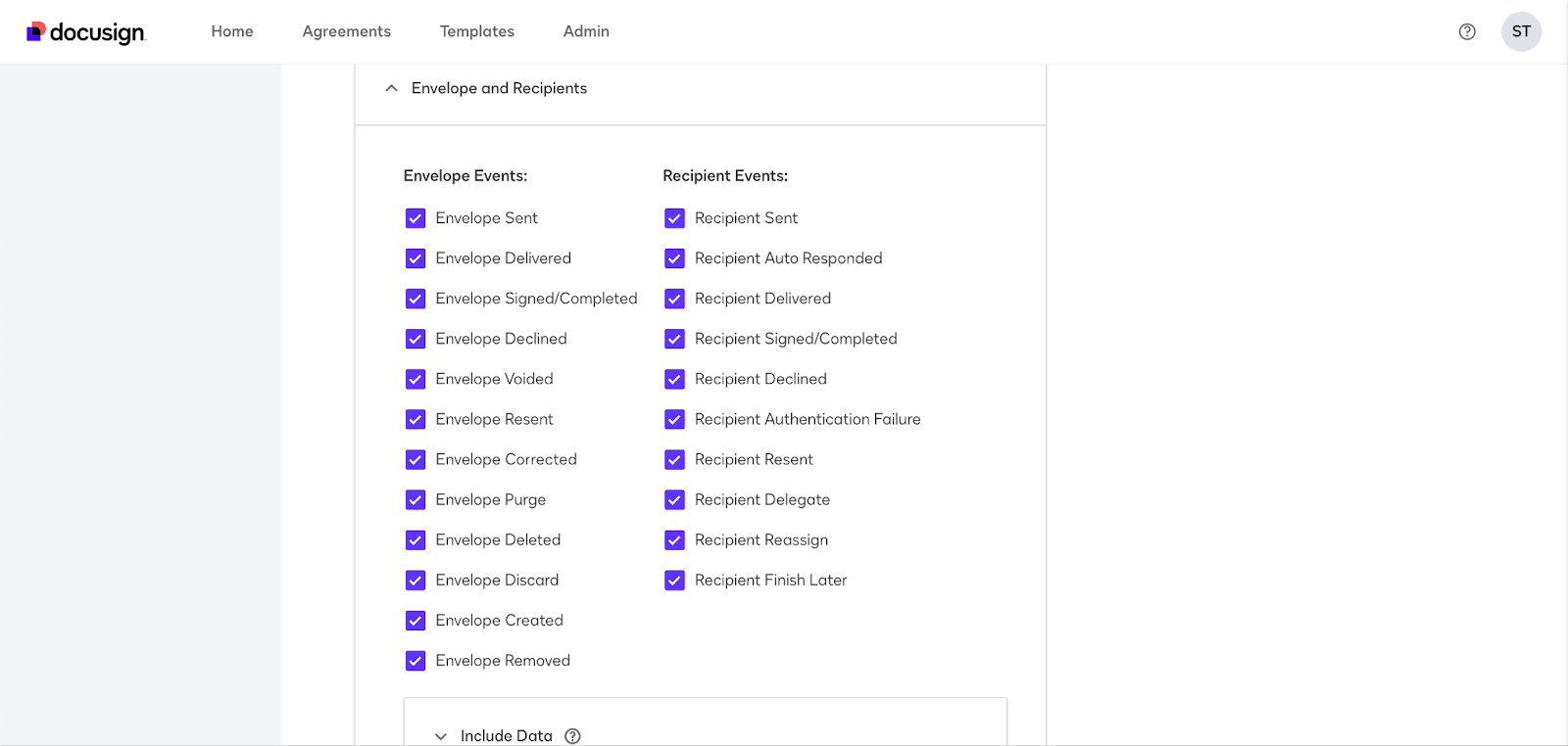 - Under the “Include Data” section, make sure to check “Custom Fields”, “Powerform” and “Recipients”